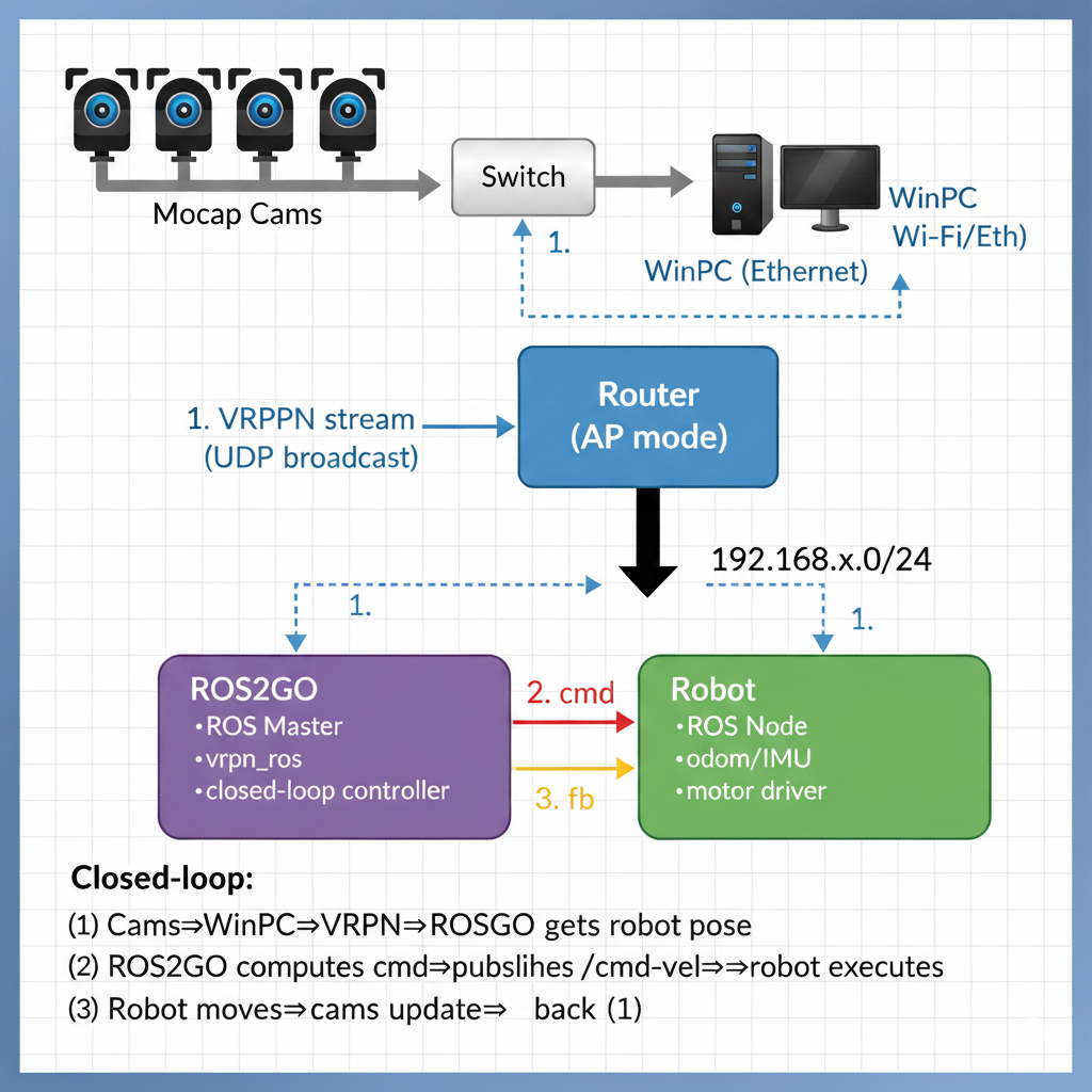 感知层:动捕相机捕捉标志点,通过交换机传给 WinPC,由 VRPN 协议广播位姿数据。